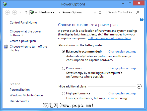 Windows 8使用电源计划来确定是否应优先考虑电池寿命或性能,就像Windows的早期版本一样。要查看电源计划设置,请按Windows键,键入电源计划,单击设置,然后按Enter。