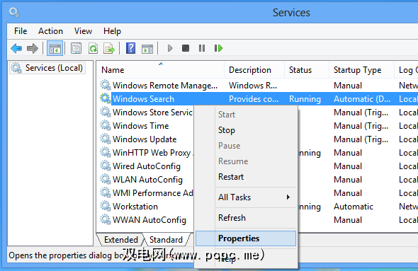 要禁用Windows搜索,请按开始,键入 services.msc ,然后按 Enter 。在列表中向下滚动,找到Windows搜索服务,右键单击它并选择 Properties。