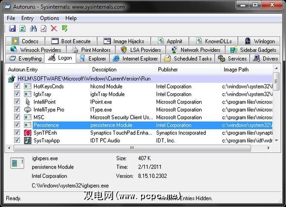 Autoruns是Sysinternals的一个程序,现在由Microsoft拥有。出现界面后,有点麻烦,无法使用大量标签导航。但是,您要查找的是“登录"选项卡,默认情况下它位于第三行(底部),在“所有内容"和“资源管理器"选项卡之间的第二排。
