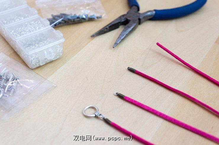 然后,将电线切成所需的长度,然后连接“电线末端"。如果电线太粗,请在拧入电线的同时扭转它。完成后,用钳子将其压接,并在每个环上附上一个小的跳环。这是一个非常愚蠢的步骤,但最终您会掌握它的。
