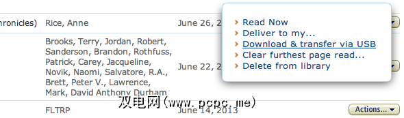 您可以将通过Amazon购买的电子书下载到您的计算机,然后将其类似地添加到Caliber。 。为此,请在Amazon网站上登录您的Amazon帐户,然后从右上角选择您的帐户->管理您的Kindle 。在这里,您会看到购买清单。在最右边的列中,从操作菜单中选择通过USB下载和传输。