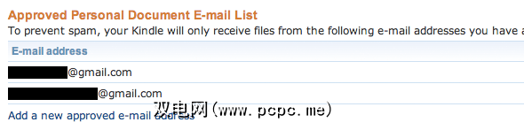 为避免垃圾邮件,您只会从某些列入白名单的电子邮件地址接收文档。如果还没有,则需要清除将用来发送电子书的Gmail地址。登录Amazon.com并转到您的帐户->管理您的Kindle->个人文档设置。在此页面底部,添加将向Caliber发送电子邮件的电子邮件地址。