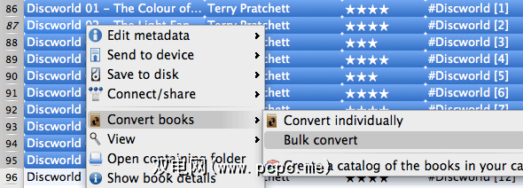 右键单击,然后选择转换书籍下的两个选项之一。通过单独转换,您可以调整选择的每本书的转换设置。这使您可以在转换之前更改为覆盖图像,元数据和其他特定于实例的数据。如果您不需要更改很多设置,请选择批量转换一次浏览大量电子书。
