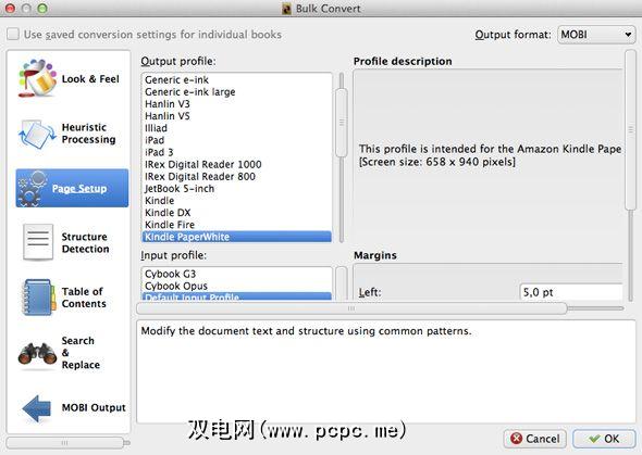 在下一个屏幕中,调整转换必要时进行设置,然后按OK。请务必在右上角选择 MOBI 或另一种Kindle兼容文件格式。如果您在欢迎向导中告诉Caliber您的eReader类型,通常可以保留其他大多数设置。如果没有,请在页面设置选项卡中选择它。