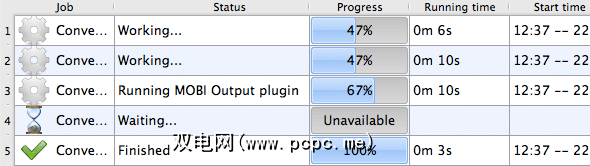 按确定后,Caliber开始运行转换作业。 Calibre主窗口的右下角有一个指示器,用于显示剩余的作业数量。单击此按钮将为您提供更多信息,如下所示。