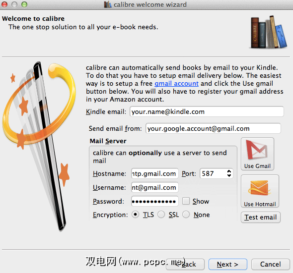 当您到达上图所示的屏幕时,您可以输入电子邮件发送的详细信息。 Caliber将需要您的Kindle电子邮件(通常采用 [email protected] 的形式)和有效的电子邮件服务器。最简单的方法是使用免费的Gmail帐户。否则,请使用您电子邮件提供商的邮件服务器信息。
