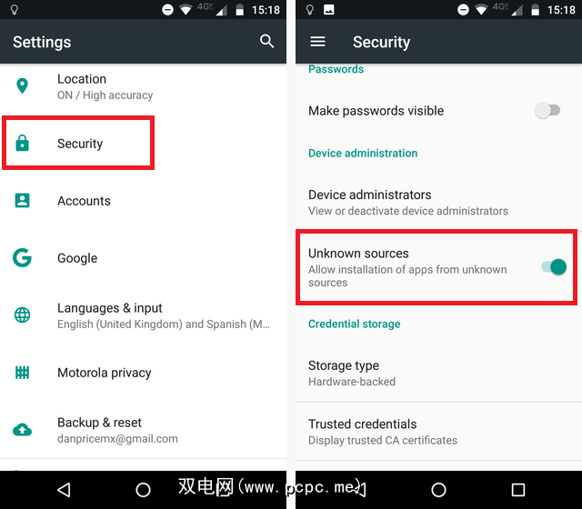 为此,请转到设置>安全性。您会在此页面上看到一个标记为未知来源的条目。将此设置为打开状态,手机将显示警告,表明您的设备更容易受到此设置的攻击。我们将在稍后讨论。点击确定暂时接受。