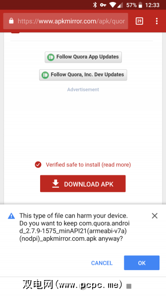 您可以直接从Android浏览器中加载应用程序。只需打开提供APK的页面并下载即可。您会看到一条警告,提示APK可能会损坏您的设备;点击确定继续。