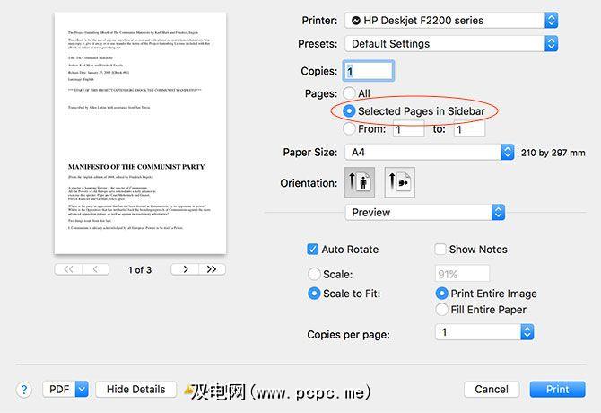 准备好后,转到文件>打印并检查侧边栏中的选定页面。点击 PDF 下拉菜单并将其另存为PDF文档,将PDF发送到iCloud或其中的其他选项之一。然后,您可以根据需要打开文档并拖动页面以重新排列它们。
