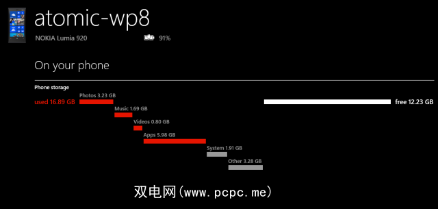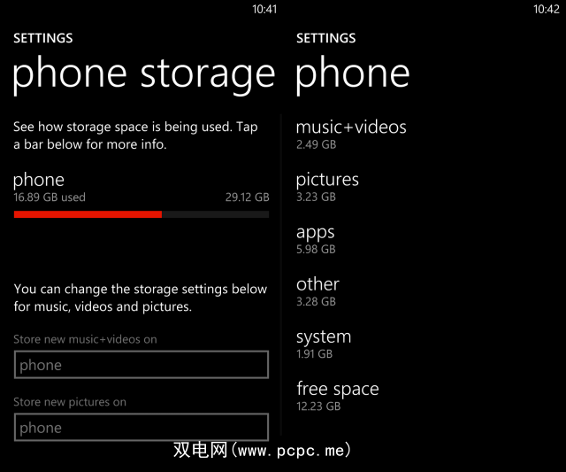 同时,您还可以检查手机上的剩余空间。所有Windows Phone 8用户都可以打开“设置">“电话存储" ,以查看Windows Phone同步工具中显示的信息的移动版本。