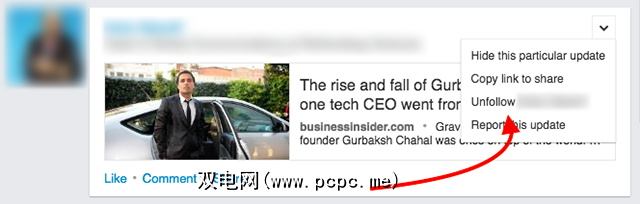 如果您不想再在LinkedIn上查看联系人的帖子,但保持连接,您可以从新闻提要中执行此操作。导航到他们分享的帖子,然后单击右上角的小箭头按钮。点击“取消关注[联系人的姓名]"以从您的供稿中删除他们的帖子。