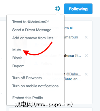 在Twitter上,转到该人的个人资料,然后单击设置图标。在此处,您可以单击“静音",并且其推文将不再显示在您的供稿中。您可以使用相同的过程取消静音。