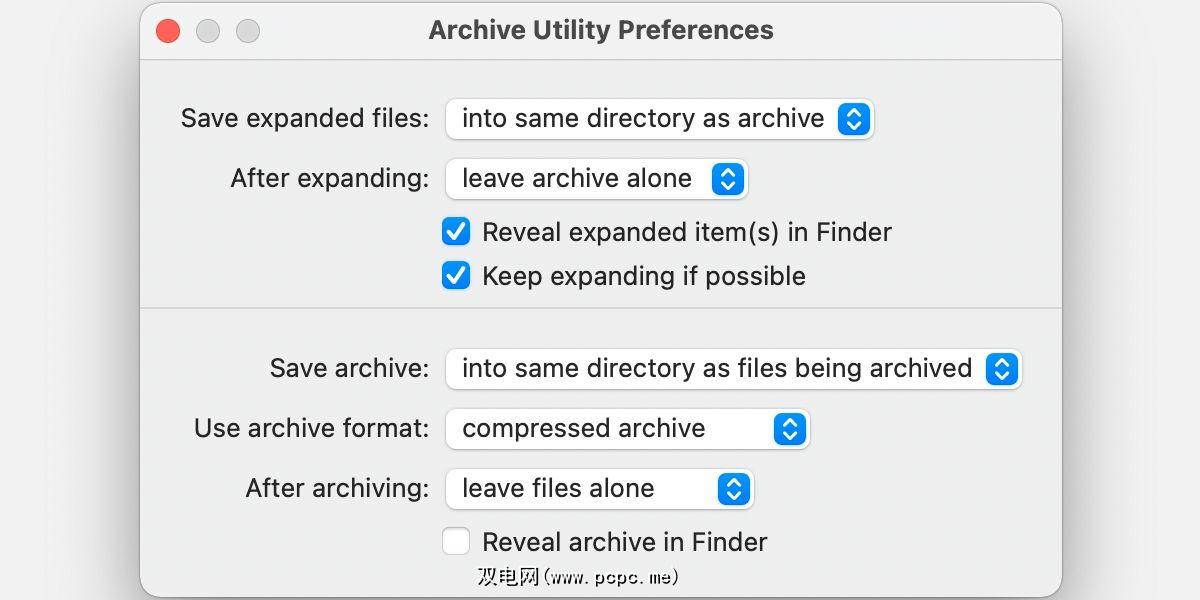 此外,您可以通过访问应用程序的首选项来更改 Archive Utility 的行为方式。设置很少,但您可以更改 Finder 的行为并选择对存档和提取的文件进行的操作。要访问存档实用程序的首选项,请按照下列步骤操作:
