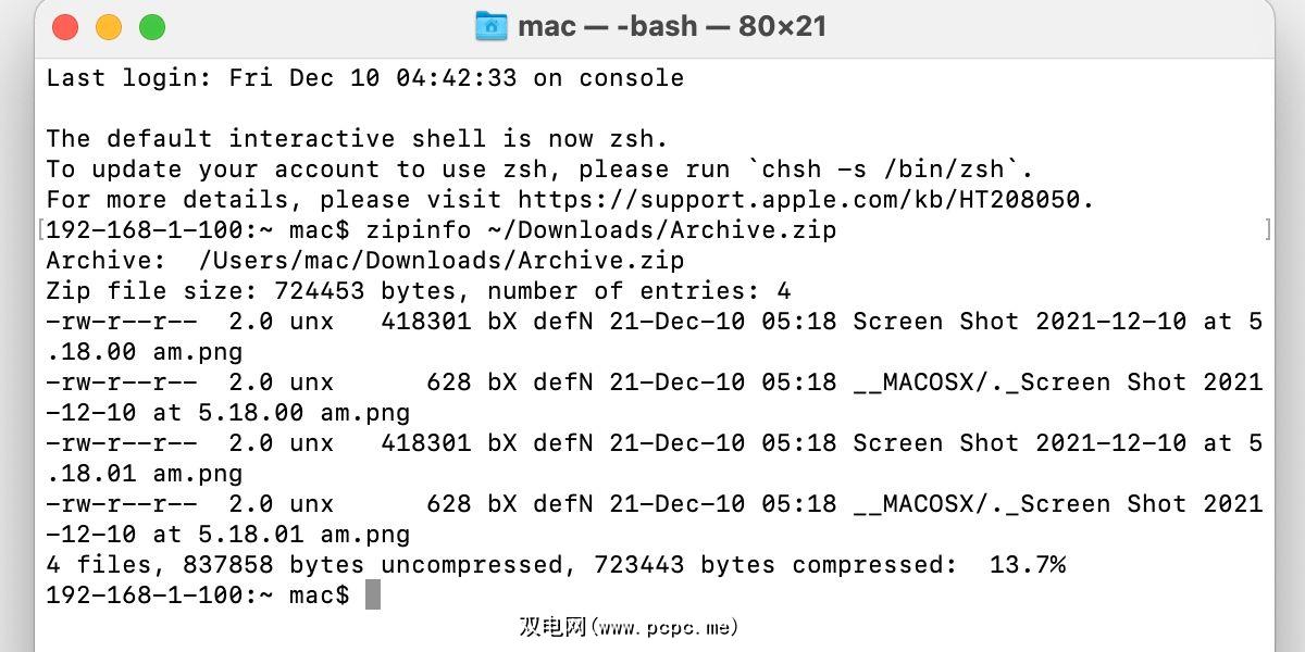 如果您想在不提取任何内容的情况下列出 ZIP 文件的内容,您可以使用简单的终端命令来完成。该命令不允许您提取单个文件,但可以让您深入了解存档中的内容,而无需涉及第三方应用程序。要在不解压的情况下查看 ZIP 文件的内容,请执行以下步骤: