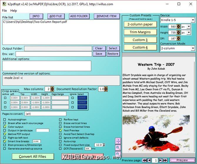 开发人员说,K2pdfopt不会尝试转换文档转换为原始文本并将其重建为PDF。而是通过将PDF / DJVU文件的每一页转换为位图来工作。 K2pdfopt会扫描位图以查找可见区域,然后进行裁剪,裁剪并将其组装成多个较小的页面,而没有多余的边距。现在,查看区域已最大化。由于页面是位图,因此请确保文件大小会增加。