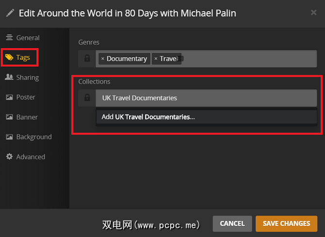 在“编辑"窗口中,转到标签>集合,然后开始键入集合的名称。该字段应自动填充。您可以将视频/系列添加到同一库中的多个集合中。
