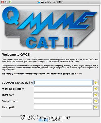 要开始设置MAME,请在QMC2文件夹中运行 qmc2-sdlmame.app 应用程序。您将看到类似下面的屏幕,要求您提供一些凭据。您只需在此处输入的内容就是您先前下载的SDLMAME可执行文件的路径(这就是为什么将其放入QMC2文件夹如此有用的原因)以及ROM的路径。