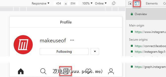 要在Chrome浏览器中执行此操作,请打开Instagram的网站并登录。然后按 F12 打开开发人员控制台。按快捷方式 Ctrl + Shift + M 或单击下面突出显示的 Toggle设备工具栏按钮,以切换到Instagram的移动网站。