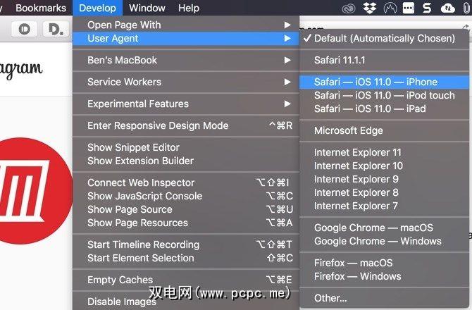 下一步,打开Instagram网站并签名in。在菜单栏上打开新的 Develop 标签,然后选择 User Agent> Safari-iOS 11.0-iPhone 。