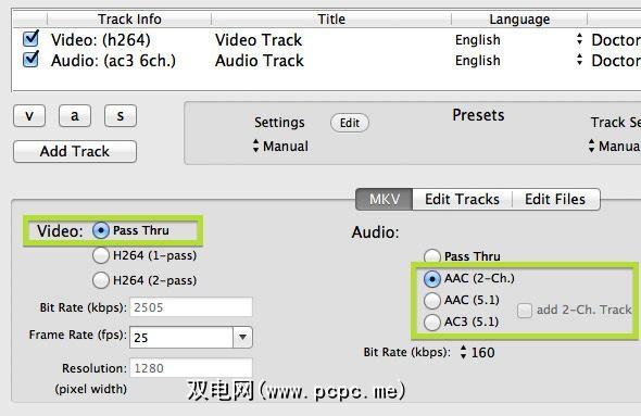 在所选的应用程序中打开MKV文件,并在必要时选择所有视频和音频轨道。要保持视频流完整,请为视频选项选择 Copy 或 Pass Thru 。您需要将音频转换为其他格式。如果您在使用杜比数字(Dolby Digital)或DTS时遇到问题,请转换为AC3(5.1)以保留具有更好兼容性的环绕声。
