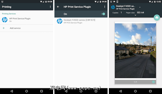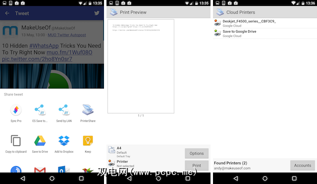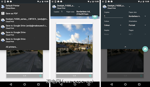 点击此按钮,您可以访问Android设备上的任何打印机设置,包括您已注册为Cloud Print打印机的打印机。点按各个屏幕,包括选择要向其注册打印机的Google帐户,并选择特定的打印机,最终您将进入标准打印屏幕。现在,您可以打印文档了。