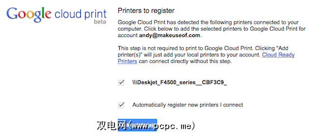 进一步向下滚动到标有Google Cloud Print的部分,然后单击管理。在“经典打印机"下,单击添加打印机。现在,您应该看到连接到计算机的打印机列表。应该自动选择它们,以及自动注册新打印机选项。如果不是,请勾选它们并点击蓝色的添加打印机按钮。