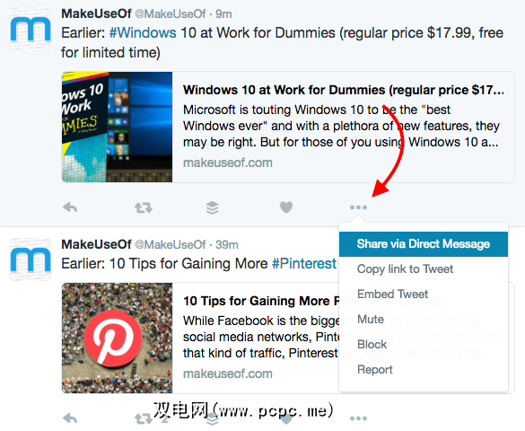 在每个推文下都有一个系列选项:回复,转发和喜欢。每个推文(三个点)下的菜单按钮包括您可以与该推文进行交互的其他方式,包括通过直接消息发送。