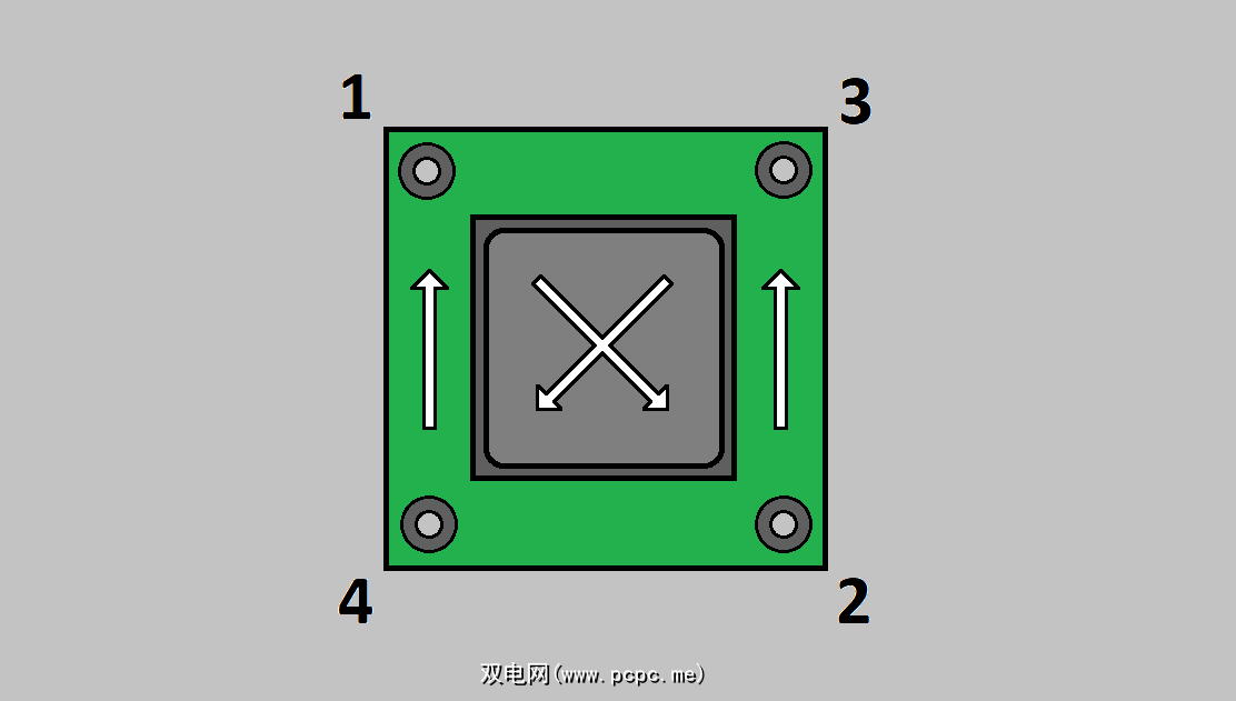 首先将铜块平放在 CPU IHS 上,然后用手指旋转每个螺钉以消除所有松弛。此时不要完全拧紧螺钉。