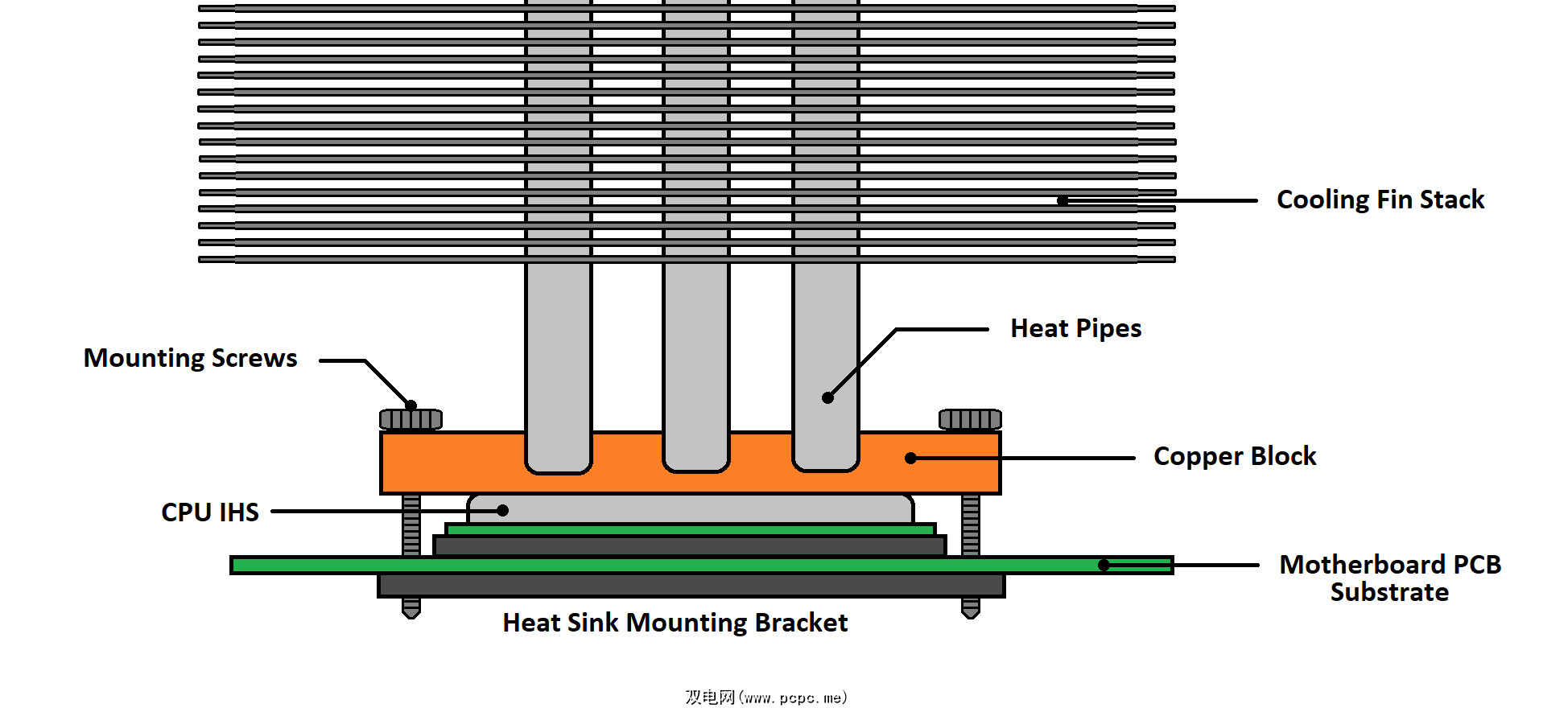 因此,如果 CPU 没有某种形式的主动冷却,那么运行现代计算机几乎是不可能的。所有冷却系统都通过铜块与 CPU IHS(集成散热器)进行热接口。在液体冷却系统中,模块连接到泵和散热器组件上,而空气冷却器的工作原理是使用连接到密集翅片组的热管将热量从模块中吸走。