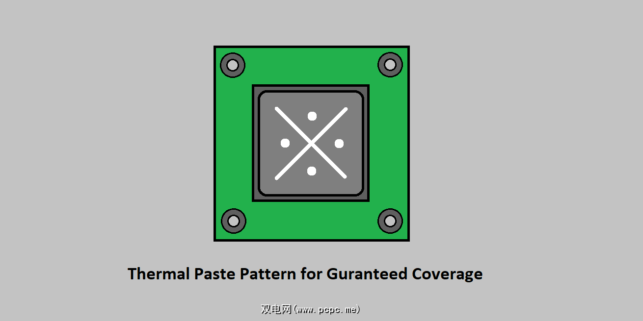 然而,当安装 CPU 冷却器时,多余的导热膏会被自动挤出。如果您使用的是非导电类型,那这不是问题,因此您最好谨慎行事并涂抹两颗十字形的糊状物,在象限之间有小点,如图所示以下。
