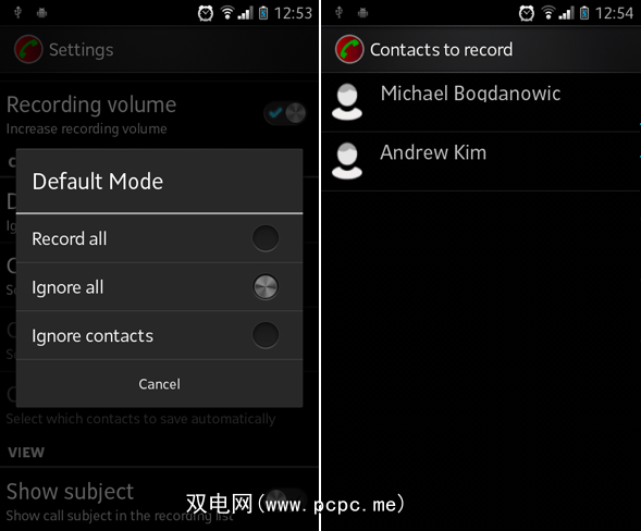 顾名思义,自动呼叫记录器将根据您设置的选项自动开始记录您的电话:全部记录(记录所有除明确忽略的联系人之外的其他电话),全部忽略(除了指定的联系人以外,不记录任何电话)和忽略联系人(记录来自非联系人的所有电话以及