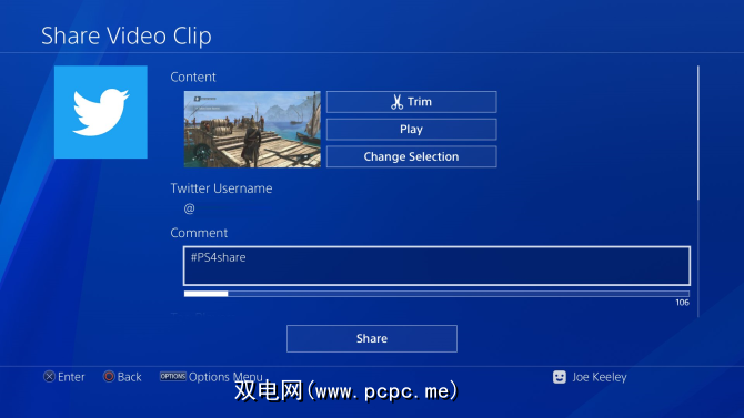 按控制器上的 Share 按钮,然后选择要共享的社交网络(例如 YouTube 或 Twitter )。