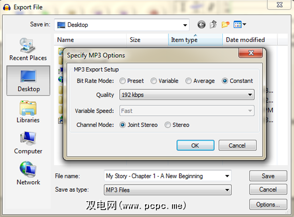 现在每章都应该被记录和编辑,并带有一个简洁的文件名和一个数字。 我的故事–第1章–新的起点。这样的命名方法可以使您更容易在计算机上建立索引,也可以更容易在Internet上找到(如果您将它放置在所有人面前)。现在,您希望将每个文件转换为更小,更可移植且可用的格式。事实标准仍然是MP3。在Audacity中,您将点击文件>导出。在打开的新窗口中,点击选项。在这里,您可以为MP3设置比特率模式和质量。许多人推荐 192 kbps ,它确实可以提供可承受的高质量文件,但是我认为您也可以摆脱128 kbps的困扰。单击确定,然后执行该操作。
