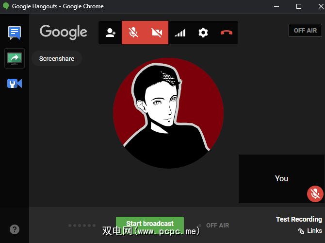 现在,您将看到一个启用了摄像头和麦克风的新Google Hangouts直播窗口,就像在环聊通话。如果需要,请单击屏幕顶部的图标以使麦克风和视频静音。然后在左侧找到 Screencast 图标,该图标看起来像是带有箭头的绿色监视器。