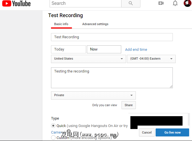 在此处,设置标题,说明和< strong>类别,随心所欲。重要的是,请确保将隐私从公开更改为私有(如果希望选择观看者,则将其更改为不公开)。在类型下,确保选择快速。点击立即上线按钮开始。