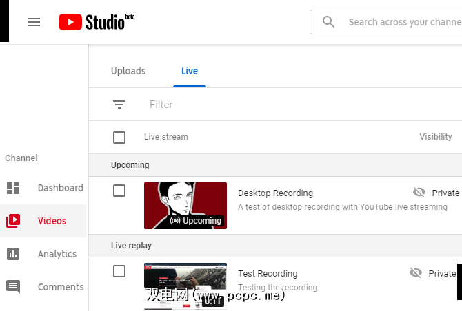 稍后您可以通过单击YouTube右上角的个人资料图标,选择< strong> YouTube Studio ,然后选择左侧栏中的视频。在此页面顶部,选择 Live (实时)以显示实时流的存档,然后您会在 Live replay (实时重放)部分下找到该录像。