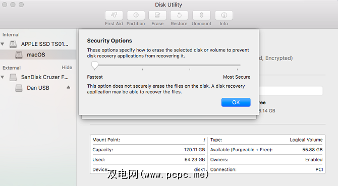 现在将注意力转移到窗口顶部,然后单击擦除按钮。操作系统将提示您擦除驱动器。