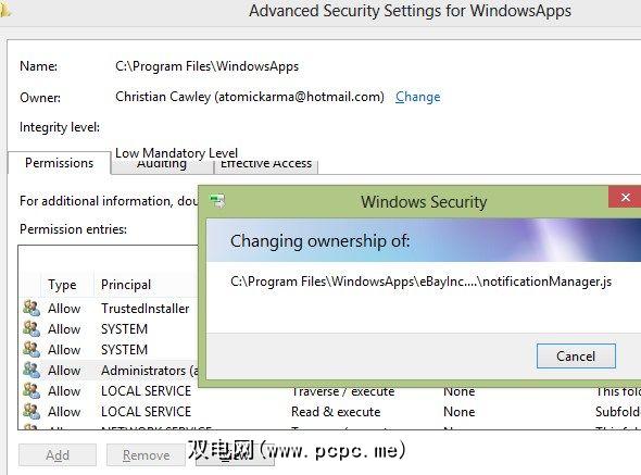 下一步,浏览到 Program Files> WindowsApps ,该文件夹将通常可以在C:驱动器上找到。您可能会发现该文件夹受到限制,在这种情况下,您应该打开安全>高级,然后将更改所有者的文件夹从TrustedInstaller更改为您自己的登录名。单击确定确认,然后单击应用进行所有权更改,并等待Windows更新文件夹。