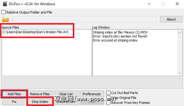 使用DivFix ++修复AVI文件是一个分为两个部分的过程。首先,您需要删除旧索引。点击添加文件,然后将应用指向已损坏的文件。您也可以在开始之前点击检查错误,但这是不必要的步骤。如果您的文件不起作用,您只想尽快修复它。