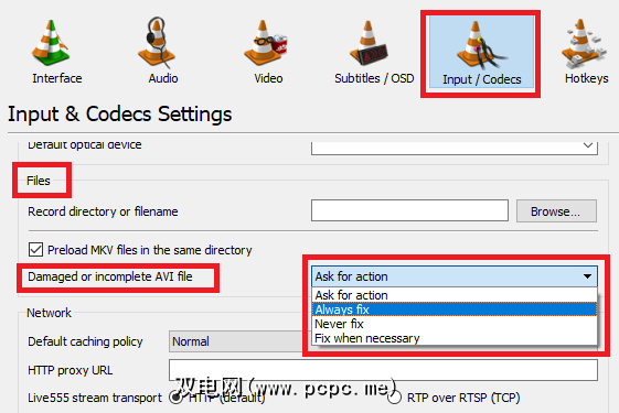如果您有很多损坏的AVI文件,并且不想定期处理屏幕上的消息,则可以使VLC在出现以下情况时自动修复文件: