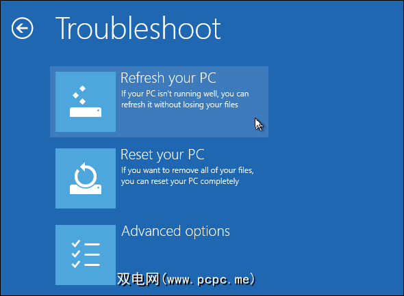 如果您使用Windows 8计算机仍然拒绝正常启动,您可能需要将其重置为干净状态。如果启动过程失败,则应该在下面的蓝屏中找到自己。如果启动失败是在启动过程中过早发生的,则可以插入Windows安装光盘或USB驱动器(与上面使用的相同),并以相同的方式访问“疑难解答"屏幕。在“疑难解答"屏幕上,选择“ 刷新计算机"选项,将计算机的系统文件重置为默认状态。