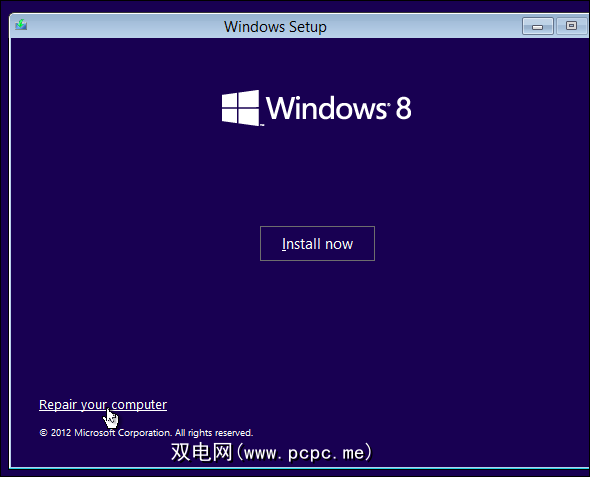 将光盘或USB驱动器插入计算机并重新启动。您应该看到Windows 8安装程序出现。指定您的语言和键盘类型,然后继续直到出现以下屏幕。单击窗口左下角的修复计算机选项。