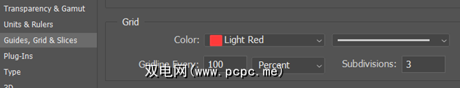 在 Photoshop ,请使用键盘快捷键 Ctrl + K (苹果机:Command + K)打开“偏好设置"。从左侧列表中单击“辅助线,网格和切片",并如下更改“网格"部分的设置: