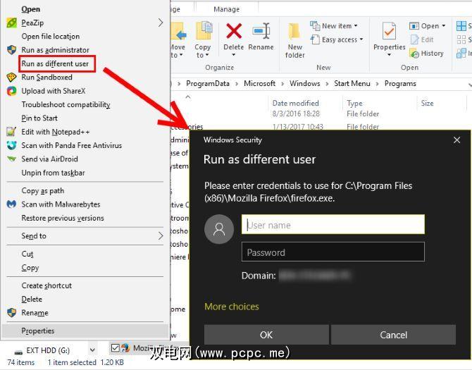 下一步,按住 Shift ,然后在出现的“文件资源管理器"窗口中右键单击所需程序的图标。点击对话框中的以其他用户身份运行,您将看到一个对话框,要求您使用其他帐户登录。输入您刚刚创建的登录信息,该应用将改为在该帐户下启动。