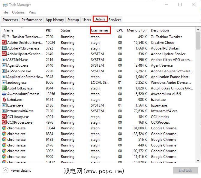 您可以通过打开任务管理器( CTRL + Shift + ESC ),然后查看详细信息标签。 用户名列包含启动该过程的用户。