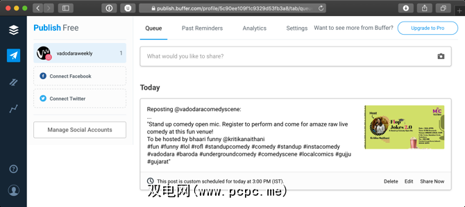 Buffer的免费计划允许您添加三个社交媒体帐户,并且在任何给定时间队列中最多可以包含10个预定帖子。如果您只计划几天才能使用一个帐户,则不要超过该限制。