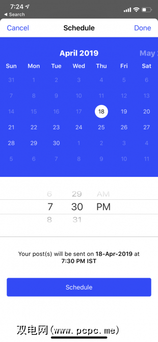 转到< strong>设置,选择您的个人资料,然后点击发布时间表。然后,您可以在一天中选择多个时隙进行发布。下次安排帖子时,只需将其添加到队列中,它将在下一个指定的时间段自动上线。