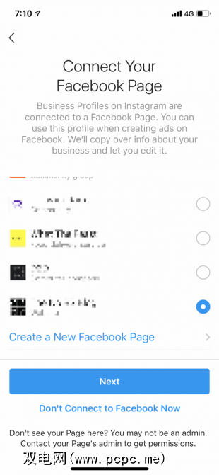 。在下一页上,系统会要求您将Facebook页面关联到您的帐户。如果您已经有一个Facebook页面,请从列表中选择它(如果您已经将Instagram帐户连接到Facebook帐户,则会显示出来)。
