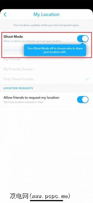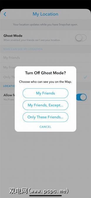 在查看我的位置下,您可能会发现虚拟模式已处于活动状态。如果并且当您关闭“幽灵模式"时,Snapchat会询问您所需的隐私设置: