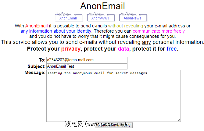 AnonEmail易于使用。您填写收件人,主题和一条简短的纯文本消息,然后填写“匿名发送"。与许多其他服务相反,AnonEMail不会(似乎)记录您的IP地址。测试时,它没有显示或跟踪我的IP地址。但是,我强烈建议您不要发送任何敏感或非法的邮件。